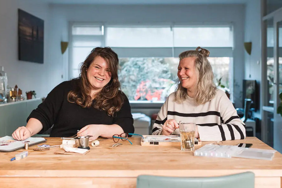 Wij (moeder Eileen en dochter Demi) maken al sinds jongs af aan sieraden. Samen hebben we in de loop van de tijd onze eigen stijl ontwikkeld. We houden ervan om te sparren en dagen elkaar uit om het steeds beter te maken, maar bovenal hebben we heel veel plezier:)