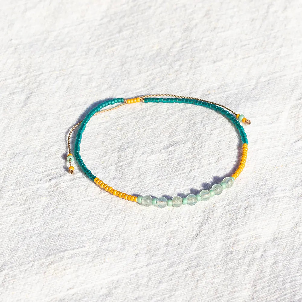 Een armbandje met interessante contrasten, een echte eyecatcher. De turquoise glaskralen halen het blauw in de apatiet mooi naar boven.