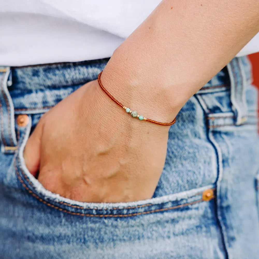 Afrikaans turquoise speelt de hoofdrol. De honingkleurige kralen zorgen ervoor dat het groen extra popt!