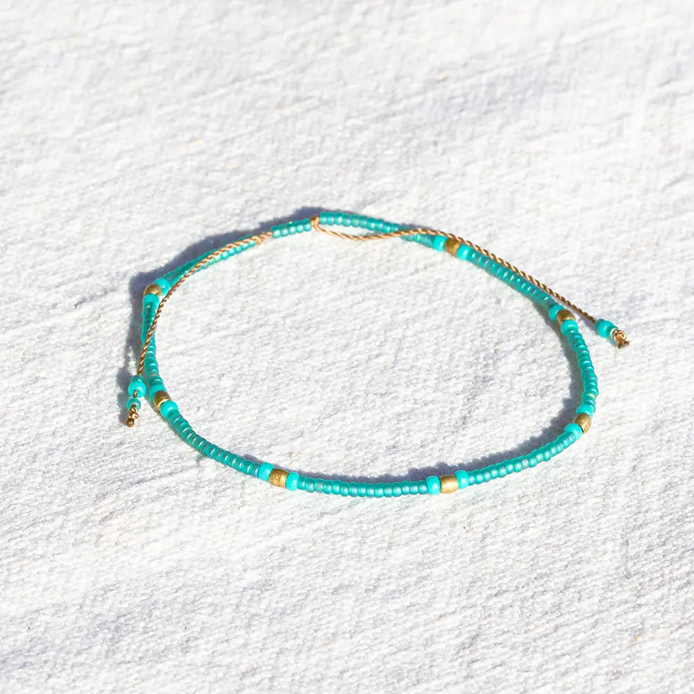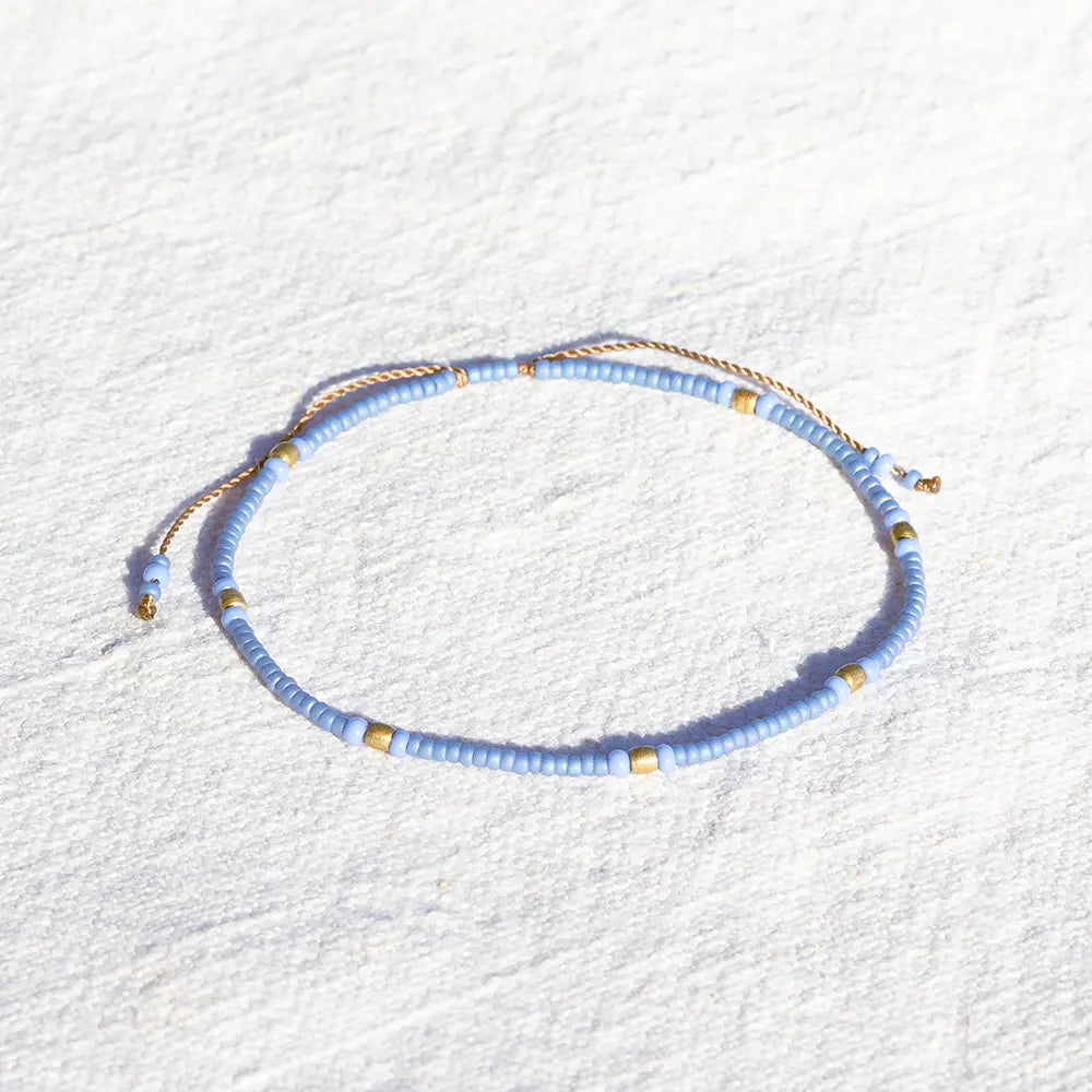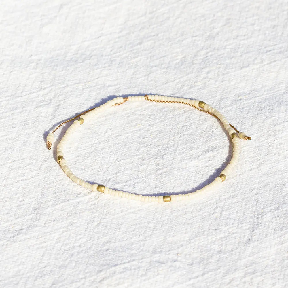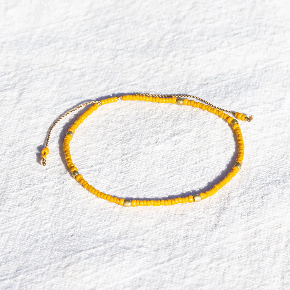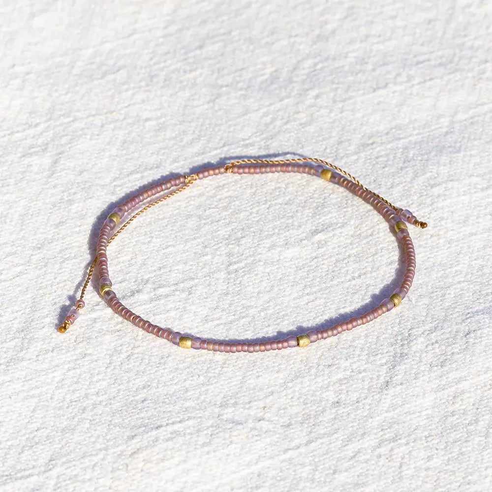 Subtiel armbandje met een mooi massief messing kraaltje. Kies uit de kleuren paars, korenbloemblauw, turquoise, crème en oker.