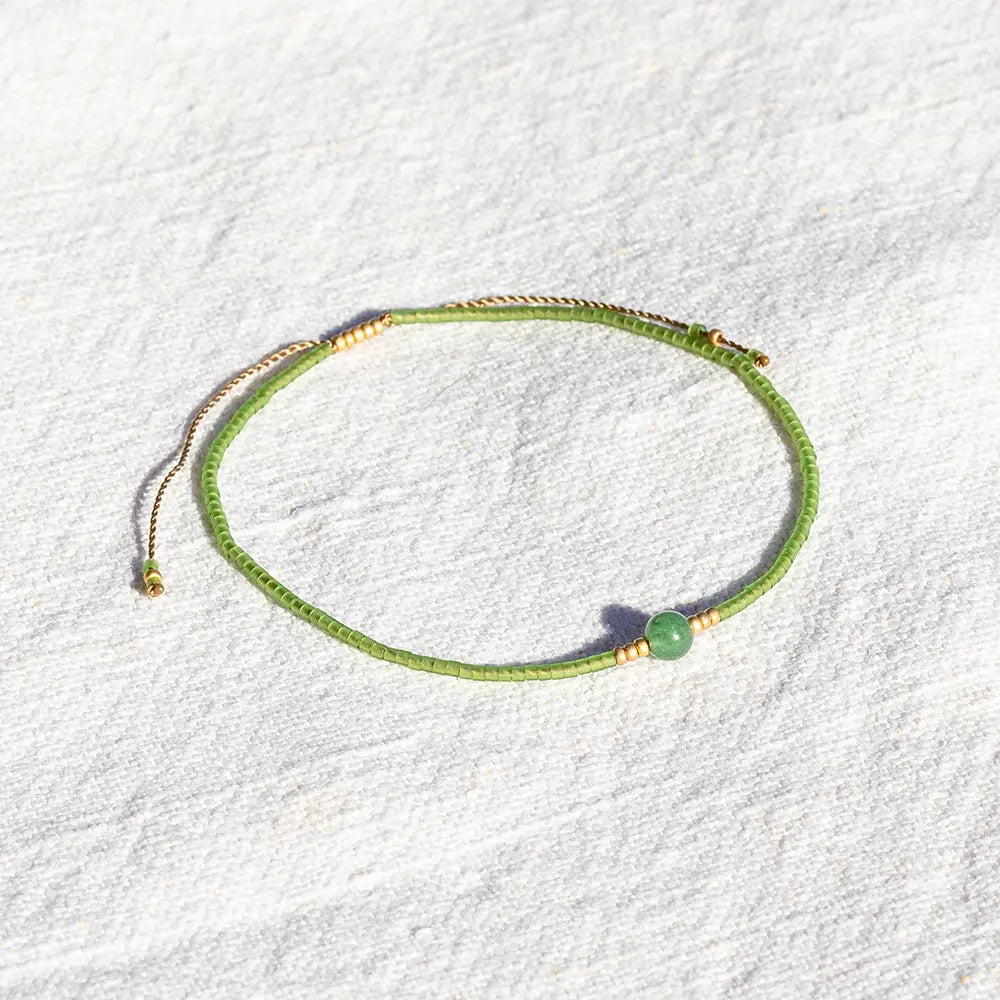 Frisgroene kralen doen denken aan gras. De perfecte omgeving voor een subtiele kraal van mosagaat.